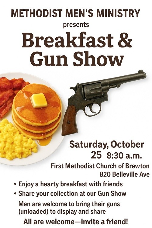 Men are welcome to participate in a Breakfast & Gun Show on Saturday, October 25, 2025, starting at 8:30 a.m. Men are encouraged to bring their guns (unloaded) and will have the chance to share the story of the gun plus have a delicious breakfast.